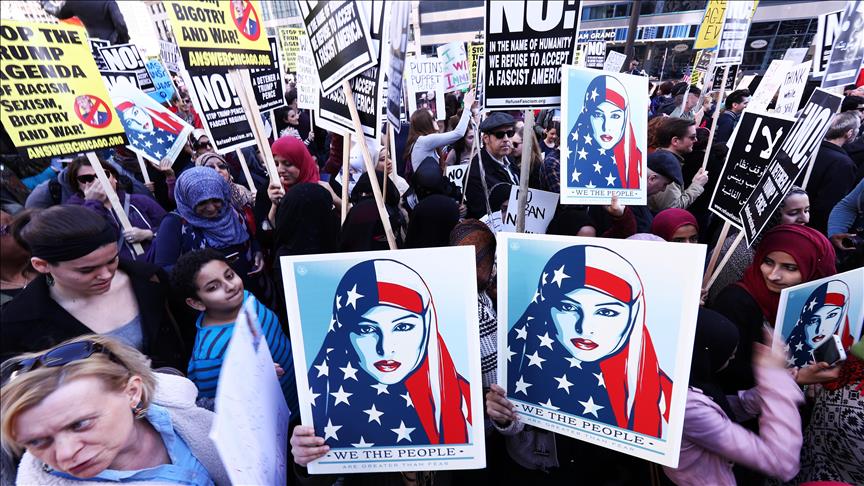 Në protestë krahas portretit të gruas së mbuluar me flamurin amerikan që është bërë edhe simbol i protestave të zhvilluara në kohët e fundit në SHBA, janë mbajtur edhe pankarta me mbishkrimet "Trump nuk është presidenti im", "Trump do të mbesë poshtë murit që dëshiron të ndërtojë", "Mirë se erdhët emigrantë dhe muslimanë".