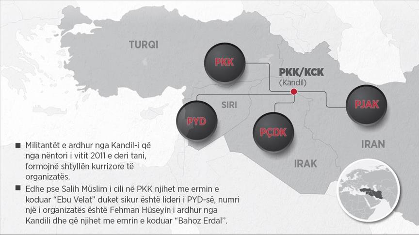 ANKARA (AA) - PYD-ja e cila në Siri është zgjerimi i organizatës terroriste PKK dhe e cila u formua me udhëzimet e Abdullah Öcalan (Abdullah Oxhallan) e pranon PKK-në si organi "i lartë ligjislativ". Organizata nuk drejtohet nga lideri i dukshëm Salih Müslim, por drejtohet nga drejtuesi i lartë i PKK-së, Fehman Hüseyin i cili njihet ndryshe edhe me emrin e koduar "Bahoz Erdal", raporton Anadolu Agency (AA).