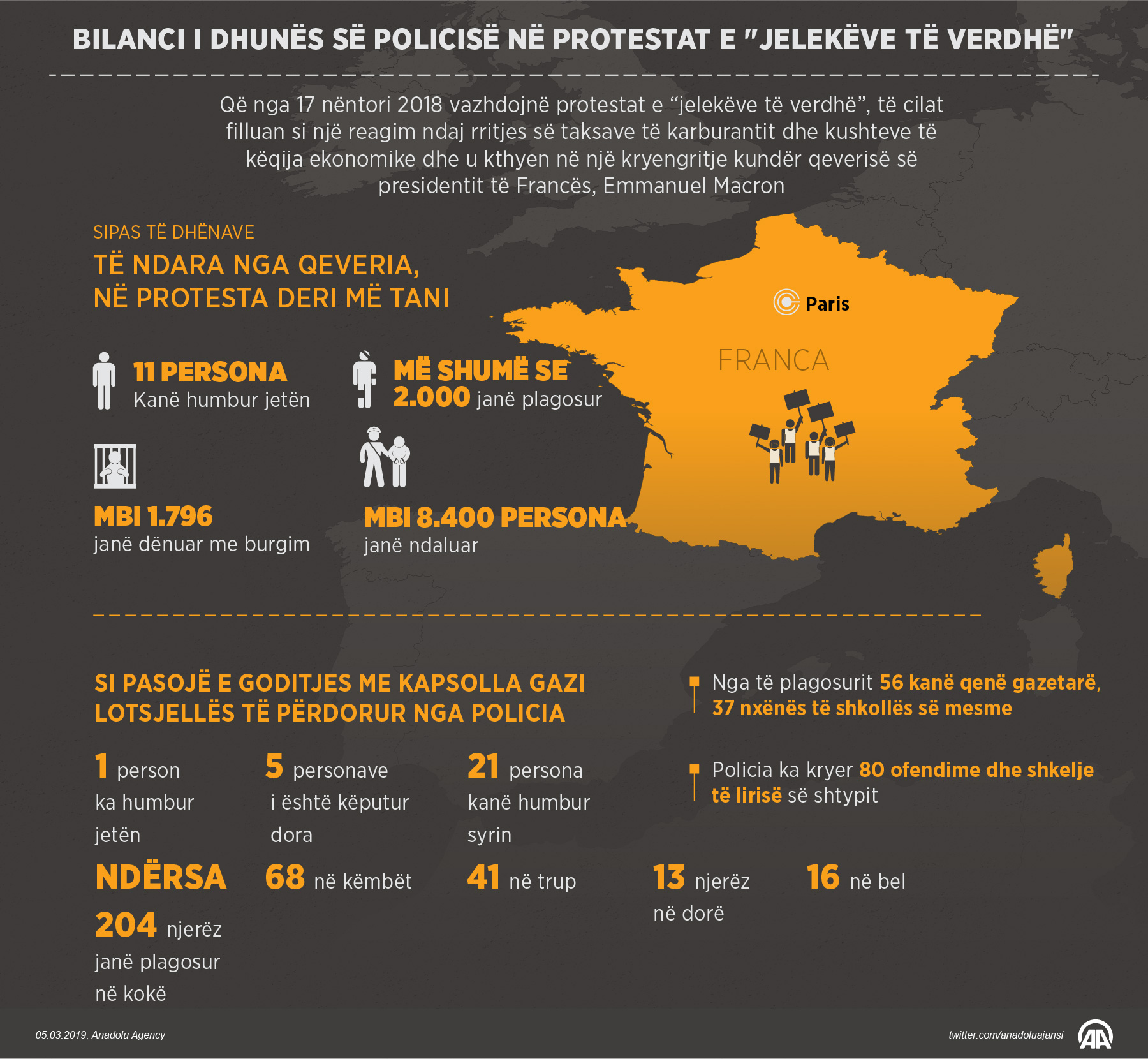 Nga kapsollat e gazit lotsjellës që policia franceze ka përdorur gjatë prostestave të "jelekëve të verdhë" të cilat vazhdojnë për më shumë se 3 muaj në Francë, jetën e ka humbur 1 person ndërsa më shumë se 368 të tjerë janë plagosur05 Mars 2019•Përditësim: 05 Mars 2019
