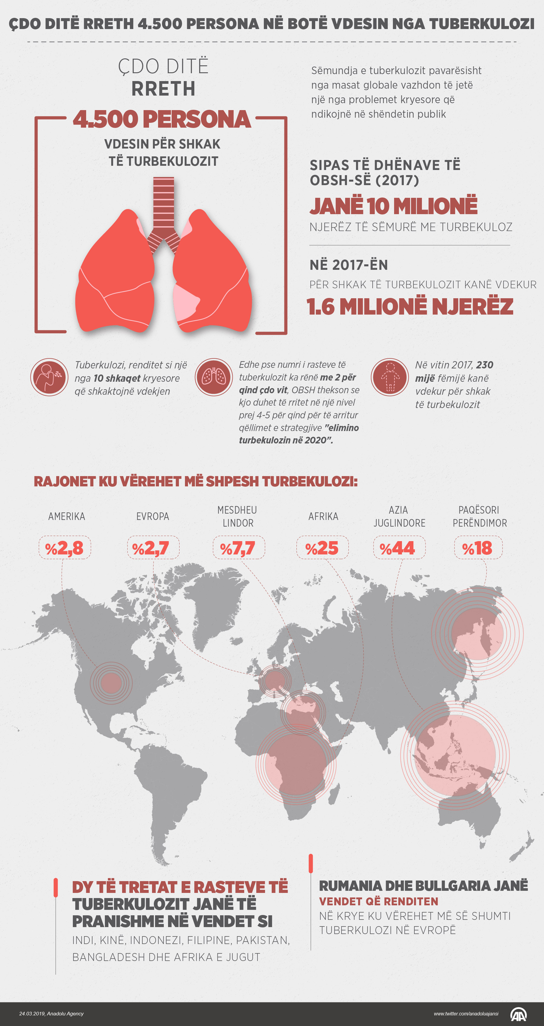 Sëmundja e tuberkulozit pavarësisht nga masat globale vazhdon të jetë një nga problemet kryesore që ndikojnë në shëndetin publik. Çdo ditë rreth 4.500 persona në botë vdesin për shkak të tuberkulozit
