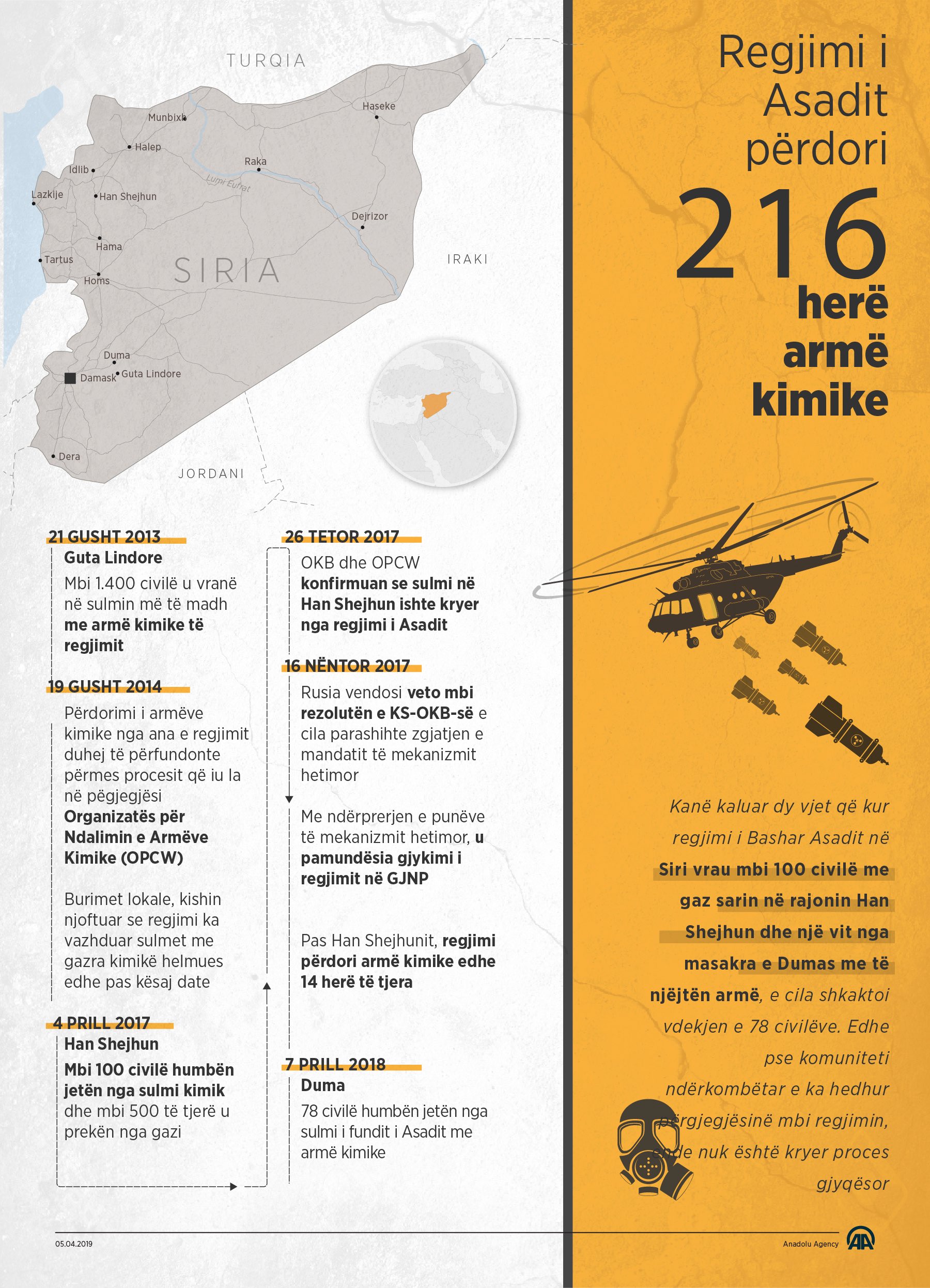 Kanë kaluar dy vjet që kur regjimi i Bashar Asadit në Siri vrau mbi 100 civilë me gaz sarin në rajonin Han Shejhun dhe një vit nga masakra e Dumas me të njëjtën armë, e cila shkaktoi vdekjen e 78 civilëve. Edhe pse komuniteti ndërkombëtar e ka hedhur përgjegjësinë mbi regjimin, ende nuk është kryer proces gjyqësor05 Prill 2019•Përditësim: 05 Prill 2019