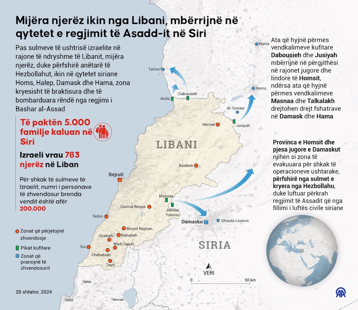 Sulmet ajrore izraelite në Liban kanë shkaktuar një migrim masiv të mijërave njerëzve që ikin drejt Sirisë, një vend tashmë i shkatërruar nga konflikti ndër vite. Më shumë se 5.500 familje libaneze, duke përfshirë anëtarë të Hezbollahut dhe të afërmit e tyre, kanë kaluar në Siri që nga fillimi i sulmeve të izraelit më 23 shtator.28 Shtator 2024•Përditësim: 28 Shtator 2024