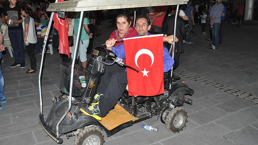 Bartın'da yaşayan bedensel engelli Şinasi ve görme engelli eşi Zülfiye Akışık, Fetullahçı Terör Örgütü'nün (FETÖ) darbe girişimine karşı Cumhurbaşkanı Recep Tayyip Erdoğan'ın çağrısından bu yana meydanlarda demokrasi nöbetine devam ediyor.