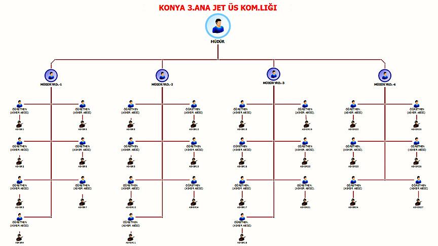 FETÖ/PDY'nin Konya 3. Ana Jet Üs Komutanlığındaki yapılanmasının en tepesindeki sorumluya "müdür", askeri personelden sorumlu olan örgüt üyelerine ise "asker abisi" ya da "öğretmen" adı veriliyor.