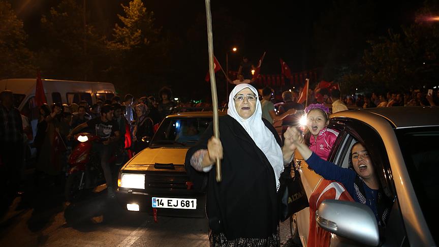 80 yaşındaki Esengül Karaca ise ilerleyen yaşına rağmen darbeye karşı alanları terk etmediklerini vurgulayarak, "Bugün birlik ve beraberliğimiz için buradayız. Kardeşliğimizi pekiştiriyoruz. Burada farklı etnikten insanlar var. İnşallah bu kardeşlik ortamı devam eder." dedi.