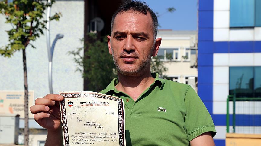 Diyarbakır'da görev yapan memur Ömer Tanık, Fetullahçı Terör Örgütü'nün (FETÖ) darbe girişimine ilişkin soruşturma kapsamında tutuklanan eski vali Hüseyin Avni Mutlu'nun 6 sene önce verdiği takdirnameyi iade etti.