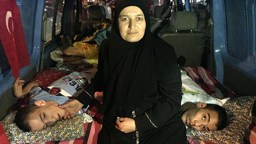 "Cumhurbaşkanımız 'bitti' deyinceye kadar ayrılmayacağız. Engellerine rağmen buraya gelip destek vermek onları çok mutlu ediyor. Çocuklarım da istiyor, kendimiz de istiyoruz, hep beraber sonuna kadar destek vereceğiz. Kimileri, insanlar evinde yatarken, uyurken engelli çocuklarım sabaha kadar gözünü kırpmadan burada bizimle beraber nöbet tutuyor. Allah devletimizden razı olsun, devletimize zarar vermesin, biz sonuna kadar devletimizin yanındayız."