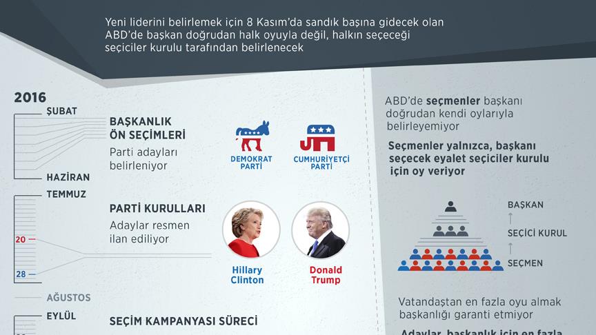 Birçok ülkenin seçim sistemiyle karşılaştırıldığında ABD'nin yeni lideri 8 Kasım'da karmaşık bir sürecin sonunda iş başına gelecek. ABD'nin yeni başkanı doğrudan halk oyuyla değil, halkın seçeceği seçiciler kurulu tarafından belirlenecek.