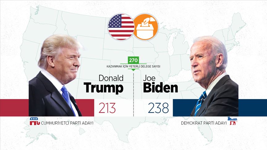 Böylece Trump, halen oy sayımı devam eden seçimlerde şu ana dek toplam 213 delegeye ulaşırken, rakibi Biden ise 238 delege kazandı.