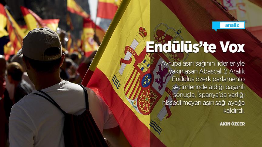 2017’de Koblenz’te yapılan Avrupa karşıtlarının zirvesine katılan ve Marine Le Pen (RN), Geert Wilders (PVV), Frauke Pettry (AfD) gibi Fransa, Hollanda ve Almanya aşırı sağının liderleriyle yakınlaşan Santiago Abascal, 2 Aralık Endülüs özerk parlamento seçimlerinde aldığı başarılı sonuçla, İspanya’da varlığı hissedilmeyen aşırı sağı ayağa kaldırdı. Bu seçimlerde 400 bine yakın oyla yüzde 11 oranını yakalayan Vox, 109 üyeli özerk mecliste 12 sandalyeye de sahip oldu. Kalesi Endülüs’te tarihi bir bozguna uğramakla birlikte yine birinci parti olan Sosyalist İşçi Partisi’nin (PSOE) yüzde 28 oy ve 33 sandalyeye sahip olduğu göz önüne alınırsa, Vox’un bu başarısını küçümsememek gerekir.