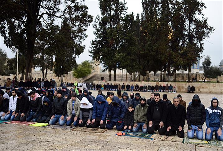 Öte yandan, cuma namazının ardından bir grup, Aksa avlusunda pankart açarak slogan atmaya başladı. Grubun çevresine toplanan binlerce kişi, "Charlie Hebdo" ve "batılı güçler" aleyhinde slogan attı. Hazreti Muhammed'e salavat getiren grup daha sonra bir bildiri okuyarak olaysız dağıldı.