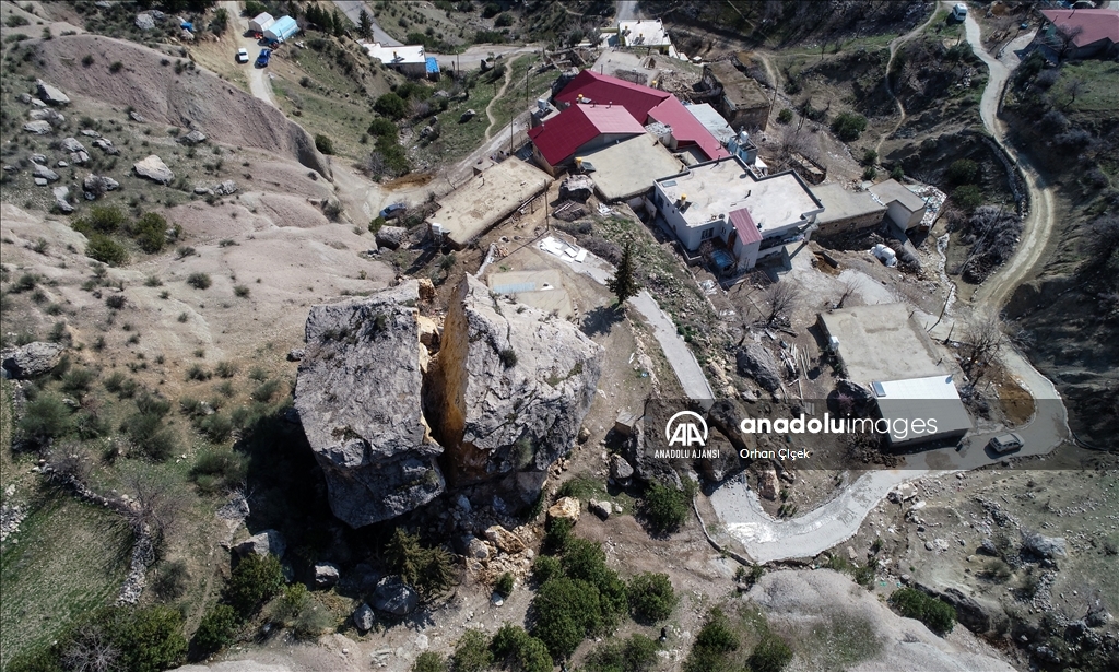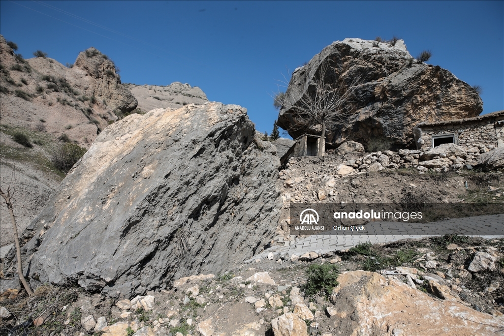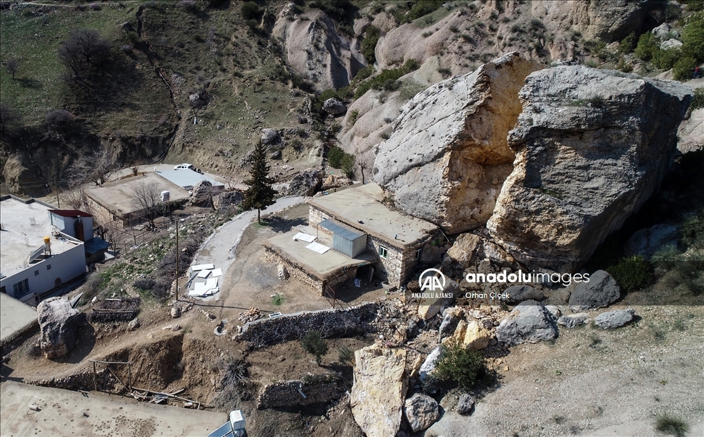 Kahramanmaraş merkezli depremlerden etkilenen Adıyaman'da, yerinden kayan dev kaya parçası eve çarparak ortadan ikiye bölünmüş halde duruyor.