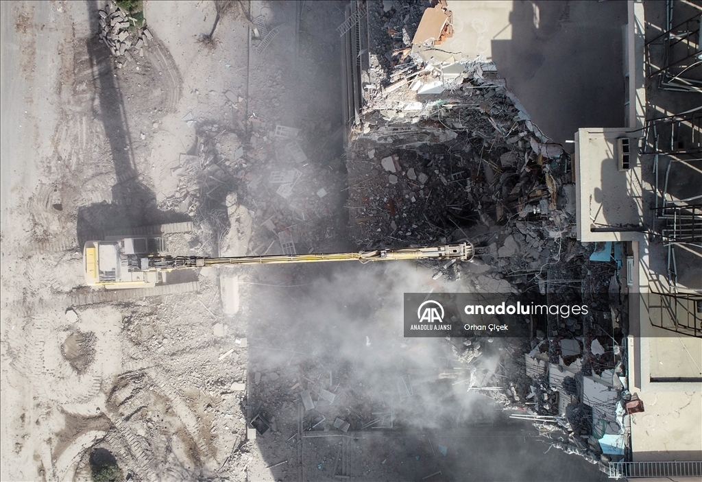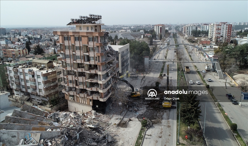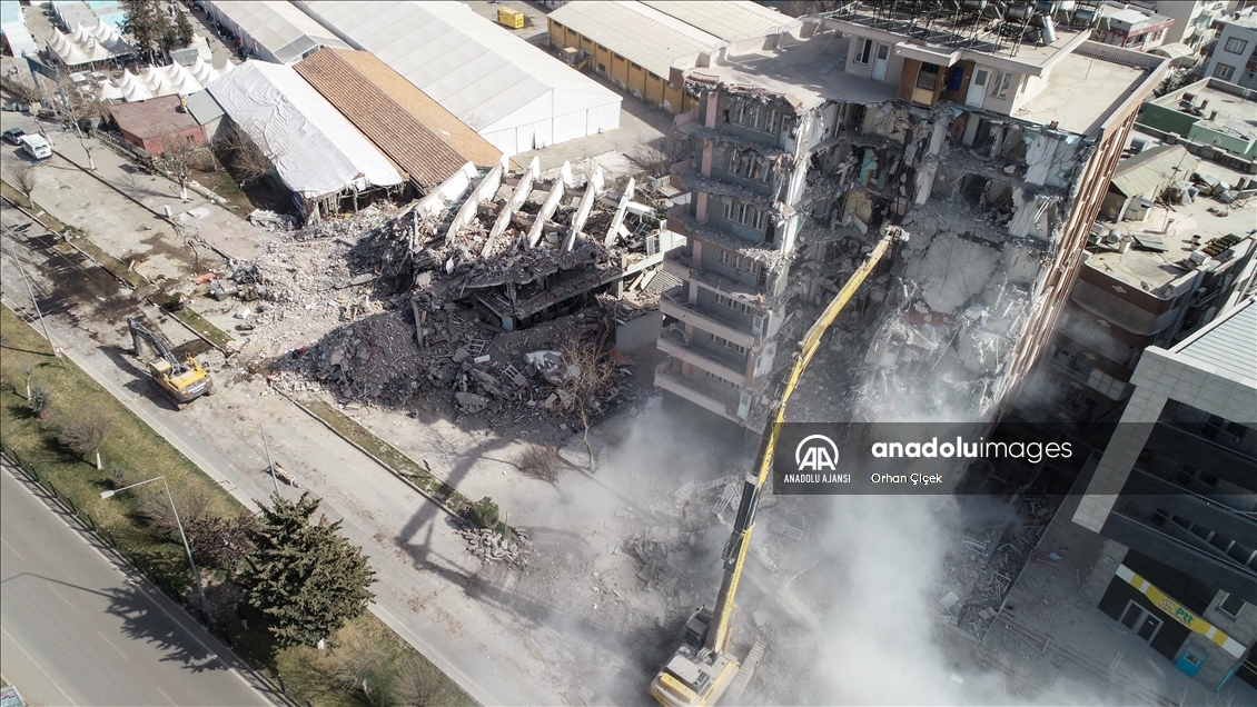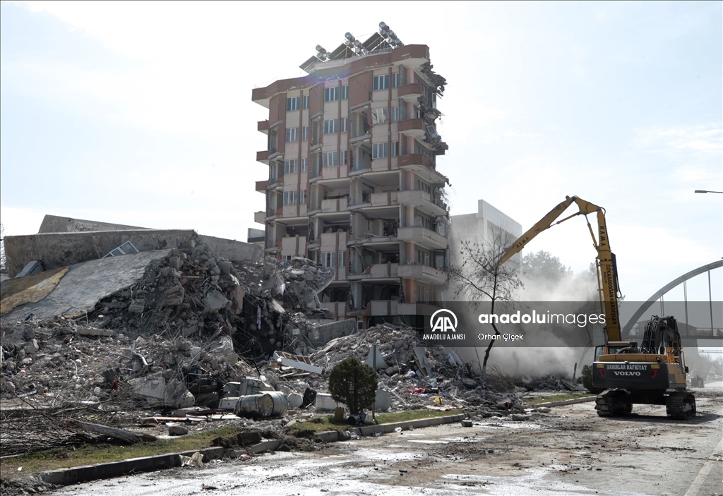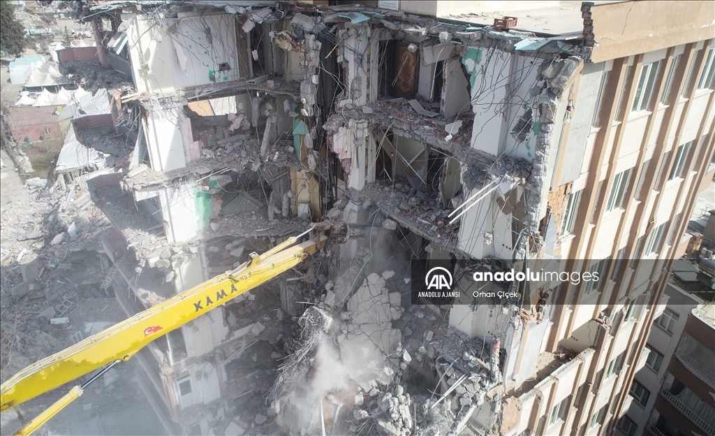 Kahramanmaraş merkezli 6 Şubat'ta meydana gelen depremlerin etkilediği Adıyaman'da acil yıkım kararı verilen binalardaki çalışmalar devam ediyor.