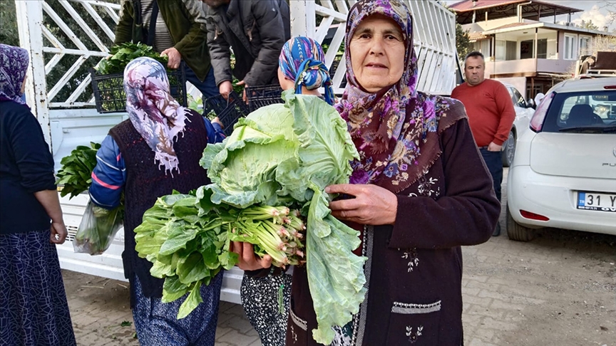 Ispanak ve lahanalar, Samandağ'ın Batıayaz köyündeki depremzedelere dağıtıldı.