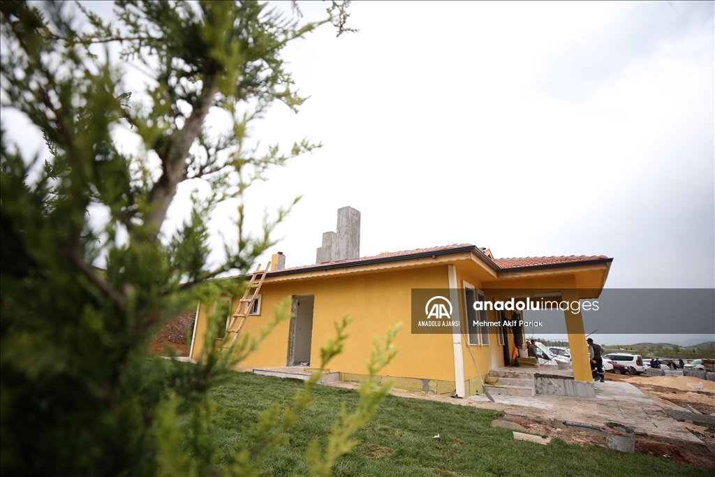Kahramanmaraş merkezli 6 Şubat'taki depremlerden etkilenen Gaziantep'in Nurdağı ilçesinin kırsal kesimindeki Belpınar Mahallesi'nde bir hayırsever tarafından yaptırılan ve Ramazan Bayramı'nda teslim edilecek köy tipi afet evlerine son dokunuşlar yapılıyor.