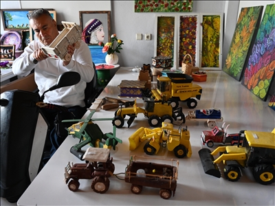 Osmaniye'de 1996 yılında iş kazasında belden aşağısının felç kalması nedeniyle tekerlekli sandalye kullanmaya başlayan Bülent Yiğit, ağaç kabuğu ve tahta parçalarından traktör, biçerdöver, kepçe, kamyon ve helikopter şeklinde oyuncaklar tasarlıyor