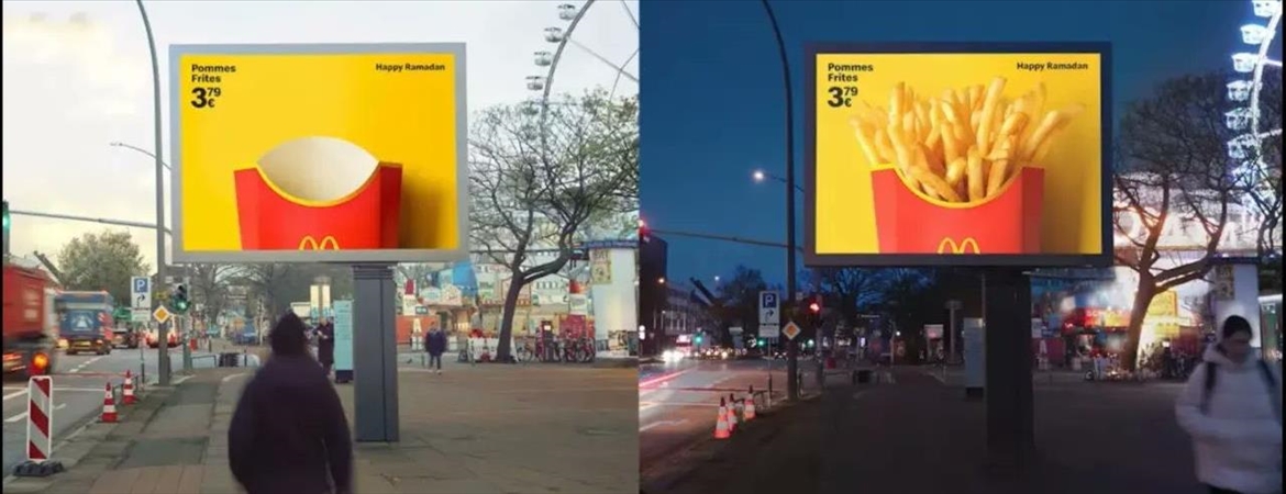 Paylaşılan fotoğraflarda, gün içinde reklam ekranlarında normalde yer alan hamburger ve patates kızartması gibi ürün görsellerinin kaldırıldığı, akşam saatlerinde ise bu görsellerin yeniden belirdiği görülüyor.