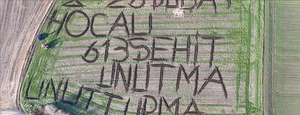 Tunçkol, traktörün pulluğuyla toprağa iz bırakarak yaklaşık 5 saatlik çalışmayla tarlasına "26 Şubat Hocalı 613 Şehit Unutma, Unutturma" yazdı.