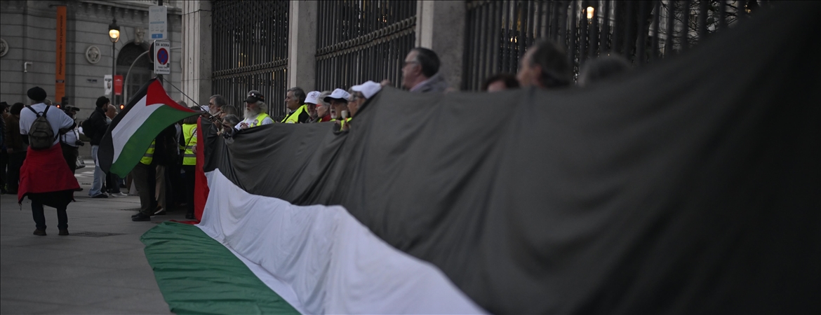 İspanya'nın başkenti Madrid'de kent merkezinde toplanan bir grup, ABD ve İsrail'in İran'a yönelik saldırılarını ve İran'ın verdiği karşılığı protesto etmek için "insan zinciri" eylemi yaptı.