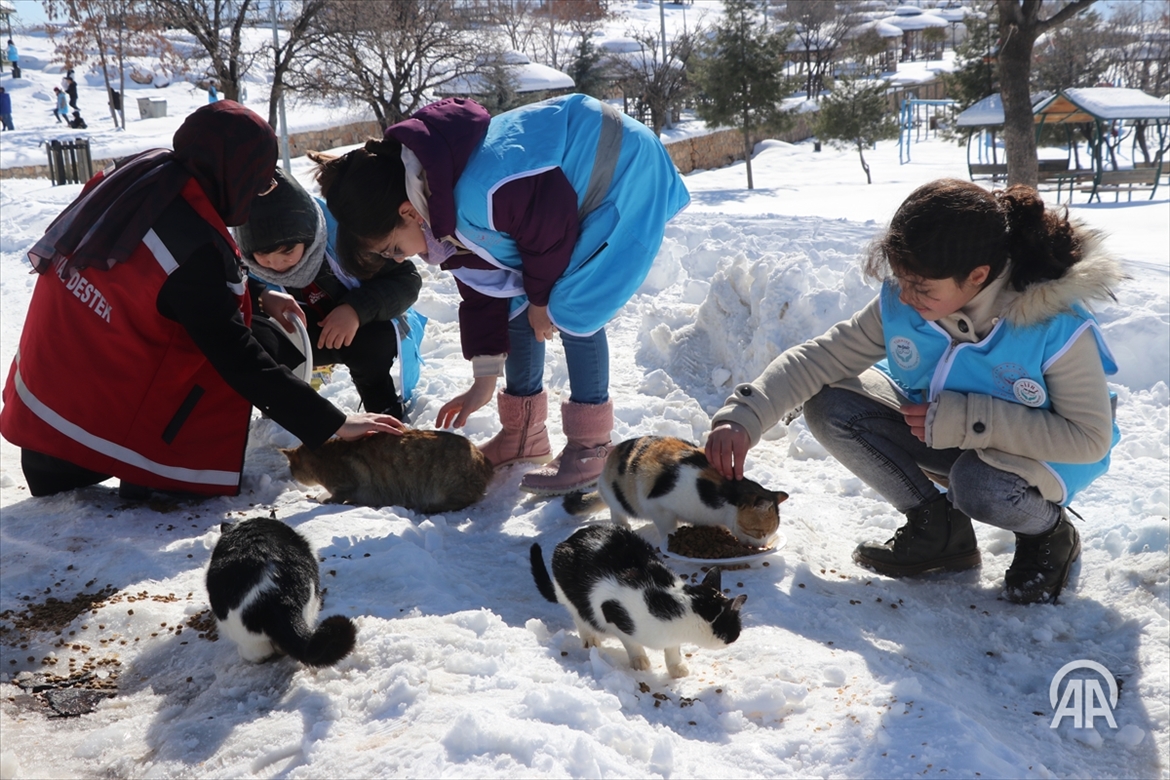 Burada önceden hazırlanan hayvan mamalarını doğaya bırakan çocuklar, ardından yemlenmeye gelen kedileri sevdi.