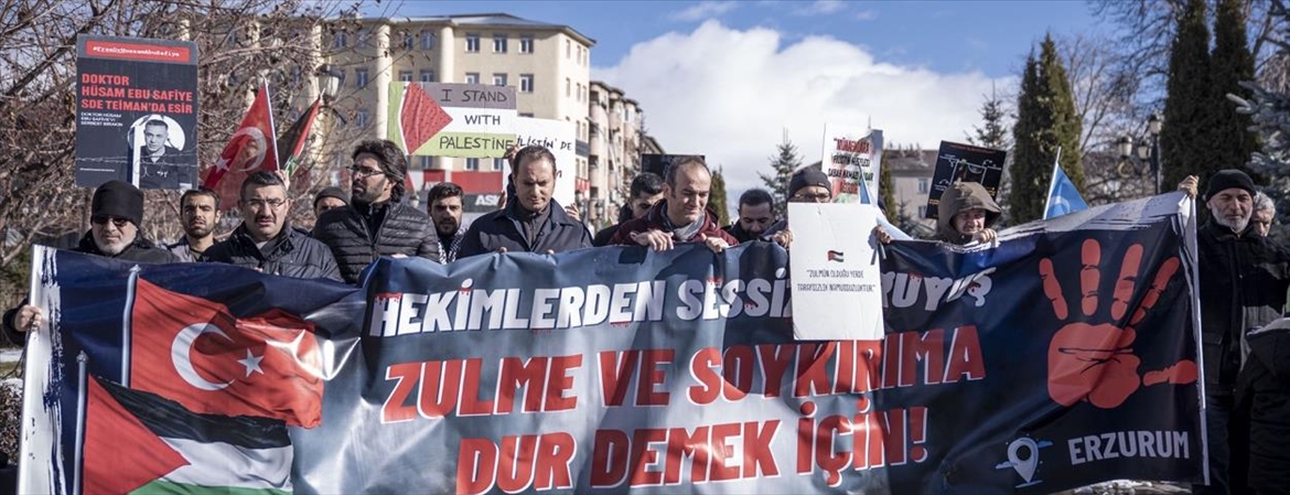 Lala Mustafa Paşa Camisi önünde bir araya gelen, aralarında doktorlar ve tıp fakültesi öğrencilerinin de bulunduğu sağlık çalışanları, Türk ve Filistin bayrakları eşliğinde taşıdıkları döviz ve pankartlarla Yakutiye Medresesi'ne kadar yürüdü.