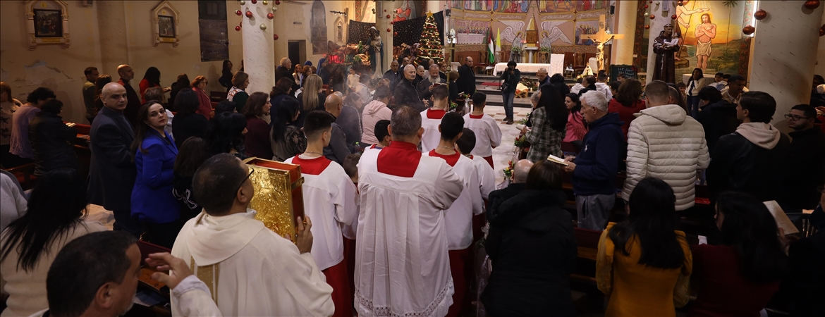 Gazze Şeridi'ndeki Filistinli Hristiyanlar, İsrail'in 2 yıl sürdürdüğü şiddetli saldırılarıyla büyük yıkıma yol açtığı Gazze'de Noel ayini düzenledi.