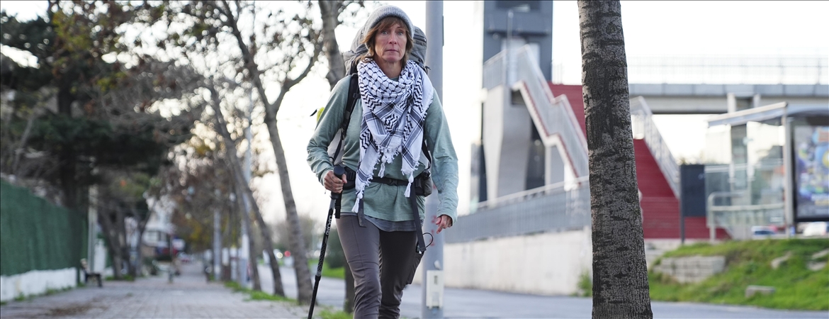 İngiliz aktivist Ruth Herbert, Filistinliler İçin Tıbbi Yardım (Medical Aid for Palestinians) kuruluşu adına bağış toplamak amacıyla Birleşik Krallık'tan İstanbul'a yürüyor.