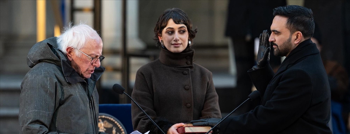 Seçim sürecinde genç Belediye Başkanı'nı açıktan destekleyen ABD Senatörü Bernie Sanders'in eşliğinde kürsüye gelen Mamdani, eşi Rama Duwaji'nin tuttuğu Kur'an-ı Kerim'e el basarak yemin etti.