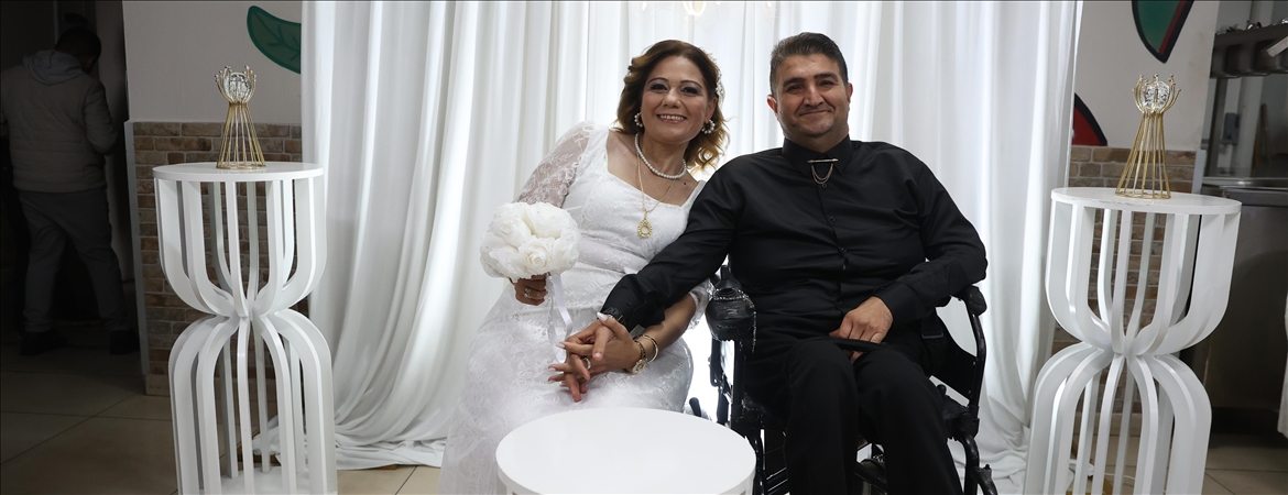 Antalya'da ilk görüşte birbirlerine aşık olup evlenme kararı alan bedensel engelli çift, bakım merkezi çalışanları ve engellilerin desteğiyle imece usulü yaptıkları düğünle hayatlarını birleştirdi.