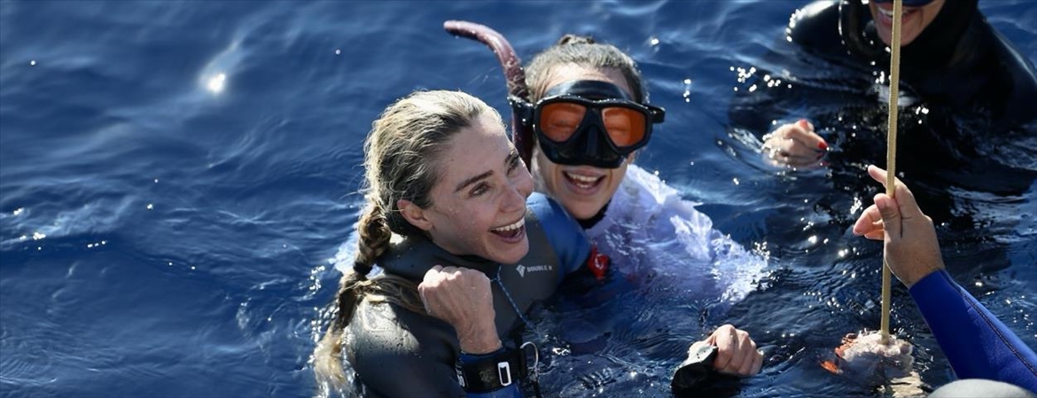 Milli sporcu Şahika Ercümen, Gazze halkına dayanışma mesajı vermek amacıyla Antalya'nın Kaş ilçesinde değişken ağırlık paletsiz dalış kategorisinde kendisine ait dünya rekorunu geliştirdi.