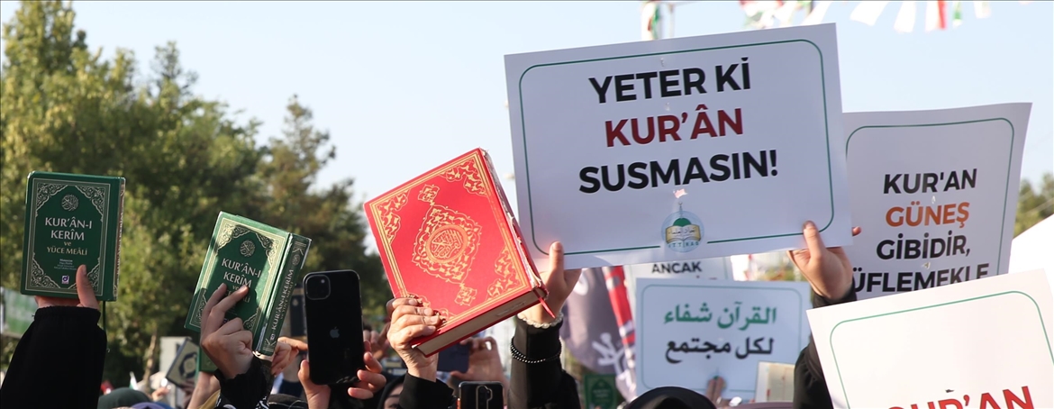 İstasyon Meydanı'ndan gerçekleştirilen "Kur'an-ı Kerim'e saygı" mitingi Kur'an-ı Kerim tilavetiyle başladı, ardından ilahiler seslendirildi.