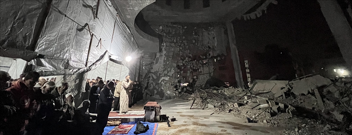 Gazze Şeridi'ndeki Müslümanlar, 2 yıl süren ağır bombardımana son veren ateşkesten sonra bu yıl teravih namazını bombalanan camilerin enkazlarında veya çadır kamplarındaki çadır mescitlerde kıldı.