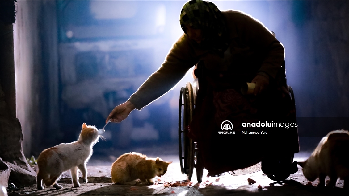 Beşşar Esed rejiminin saldırıları nedeniyle Suriye'nin kuzeybatısındaki İdlib ilinde yerinden edilen 61 yaşındaki İbtisem Seyid, tekerlekli sandalyesiyle dilenerek hem engelli oğluna hem de 10 kedisine bakıyor.