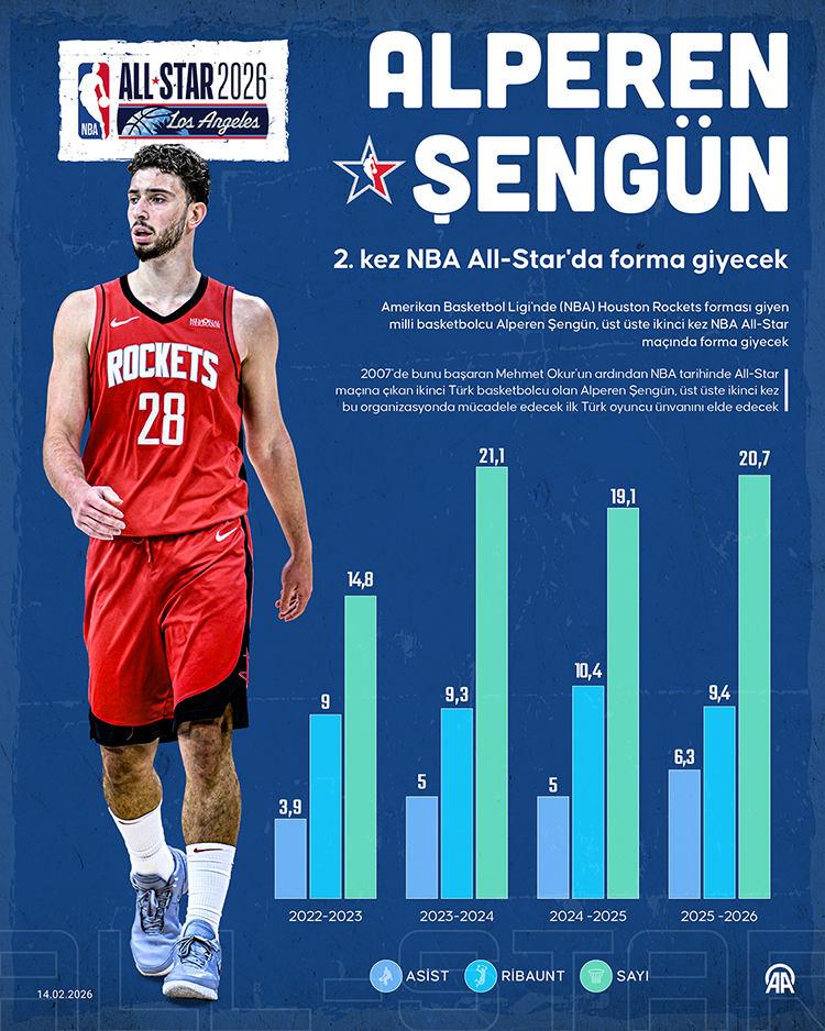 Amerikan Basketbol Ligi'nde (NBA) Houston Rockets forması giyen milli basketbolcu Alperen Şengün, üst üste ikinci kez NBA All-Star maçında forma giyecek.
