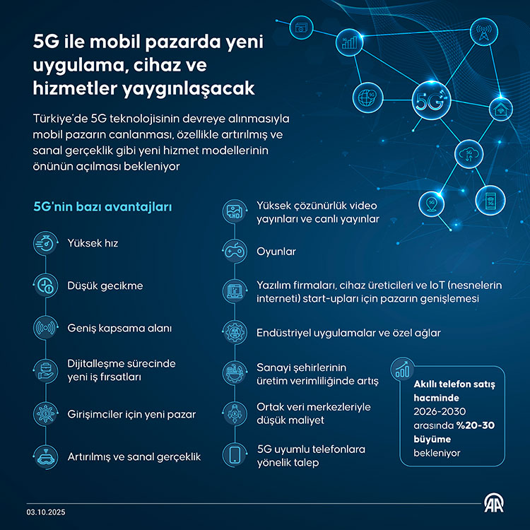"Bu teknolojiyle yüksek bant genişliği isteyen, örneğin artırılmış ve sanal gerçeklik, yüksek çözünürlüklü video yayınları, canlı yayın, oyun gibi uygulamaların daha yaygınlaşacağı öngörülüyor. Endüstriyel uygulamalar ve özel ağlar devreye girebilir. Fabrikalar, lojistik merkezleri veya maden sahaları için düşük gecikmeli, güvenli özel 5G ağları kurulabilecek. Serbest işletmeciler, bu alanda hem altyapı hem yazılım çözümleri sunabilir. Ayrıca robotlar, yapay zeka destekli üretim hatları ve artırılmış gerçeklik destekli bakım süreçleri 5G ile daha verimli hale gelir. Türkiye'de 5G ile yerli ekosistem güçlenecek, yazılım firmaları, cihaz üreticileri, IoT (nesnelerin interneti) start-upları için pazar genişleyecek. BTK, serbest işletmecilerin 5G tabanlı yenilikçi hizmetlere yönelmesi için pilot bölgeler, teşvikler ve test sahaları oluşturuyor. Türkiye, Avrupa, Orta Doğu ve Asya arasında köprü konumunda olduğu için 5G destekli veri ve hizmet merkezleri için stratejik bir hub olabilir."