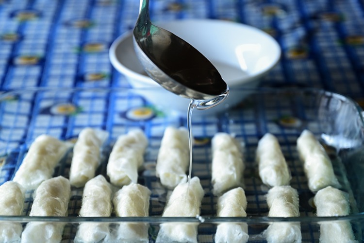 7. İki su bardağı şeker, 2,5 su bardağı suyun kaynatılmasıyla elde edilen şerbet, tepsiye dizilen güllacın üzerine dökülür. Güllaç, 10-15 dakika dinlendirildikten sonra servis edilir.