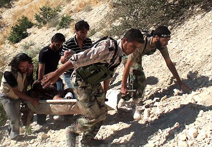ÖSO'ya bağlı destek birimi, beldede süren çatışmada yaralanan muhalifleri cephe gerisine taşımak için derin bir vadiden Eriha'ya girdi. AA ekibi, çatışmada yaralananları sarp vadiden çıkarmaya çalışan muhalifleri görüntüledi.