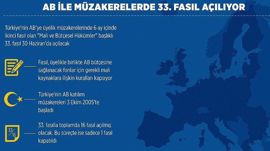 Türkiye'nin Avrupa Birliği'ne (AB) üyelik müzakerelerinde 6 ay içinde ikinci fasıl olan "Mali ve Bütçesel Hükümler" başlıklı 33. fasıl bu hafta açılacak.