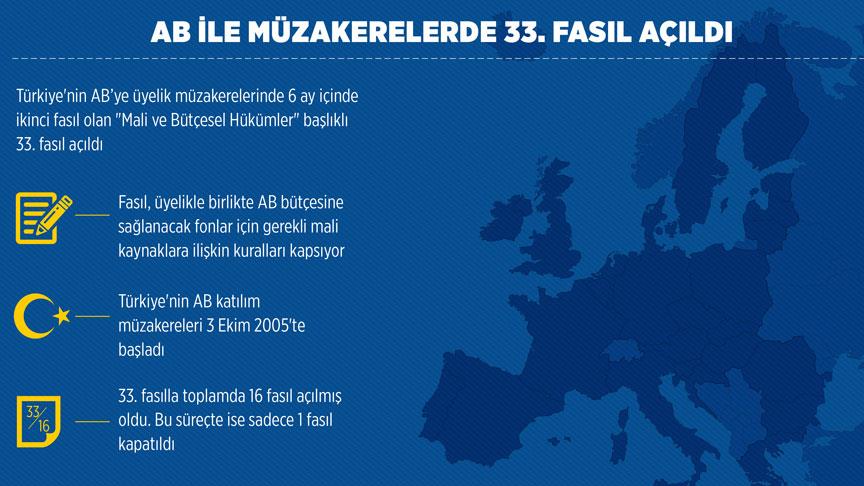 Türkiye'nin, Avrupa Birliği'ne (AB) katılım müzakerelerinde "Mali ve Bütçesel Hükümler"başlıklı 33'üncü fasıl açıldı. Böylece katılım müzakerelerinde açılan fasıl sayısı 16’ya ulaştı.