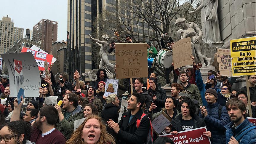 Manhattan'daki Central Park'ın güneybatı köşesinde bulunan Trump Plaza yakınındaki Columbia Circle'da toplanan bine yakın protestocu plazaya yürüdü. Binanın önünde "Donald Trump defol", "Donald Trump ırkçı, İslam karşıtı, kadın karşıtı ve cinsiyet ayrımcı" gibi sloganlar atan göstericiler, "1 Donald Trump'ı 25 bin mülteciye değişirim", "Siyahların yaşamı önemlidir", "Hiçbir insanoğlu illegal değildir" yazılı dövizler taşıdı.