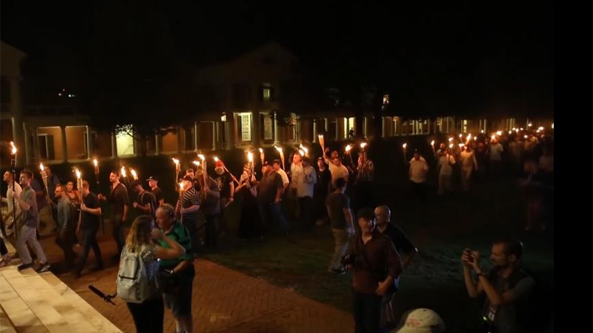 BBC'nin haberine göre, faşist Ku Klux Klan örgütünü anımsatacak biçimde meşaleler taşıyan protestocular, Virginia Üniversitesinde düzenledikleri gösteri sırasında "Yahudiler yerimize geçemeyecek", "kan ve toprak", "tek halk, tek ulus, göçe son" sloganları attı.