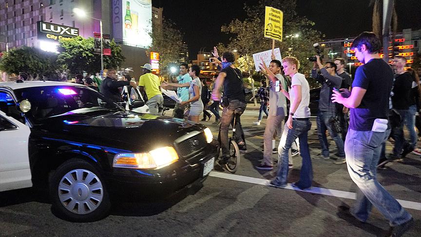 Çevredeki iş yerlerinin ve arabaların camlarını kıran, çöpleri yakan ve trafiğin aksamasına neden olan protestoculara polis biber gazı ile müdahale etti.