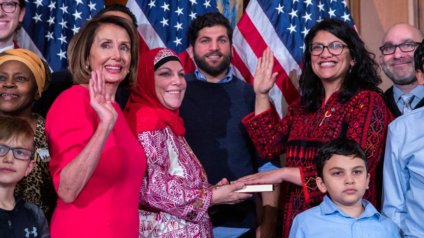 İlk olarak Demokrat Vekil Nancy Pelosi'nin Temsilciler Meclisi başkanı seçildiği törende, aralarında Michigan eyaletinden Temsilciler Meclisi'ne seçilen Filistin asıllı Müslüman Rashida Tlaib ve Minnesota eyaletinden Somali asıllı Müslüman İlhan Omar'ın da bulunduğu 435 üye yemin etti.