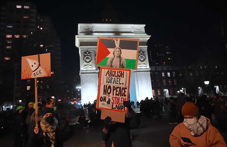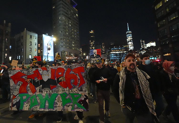 New York'ta bir araya gelen protestocular, ABD İç Güvenlik Bakanı Kristi Noem'in basın toplantısı yaptığı esnada dışarIda gösteri düzenledikten sonra, Dünya Ticaret Merkezi'ne yürüdü.