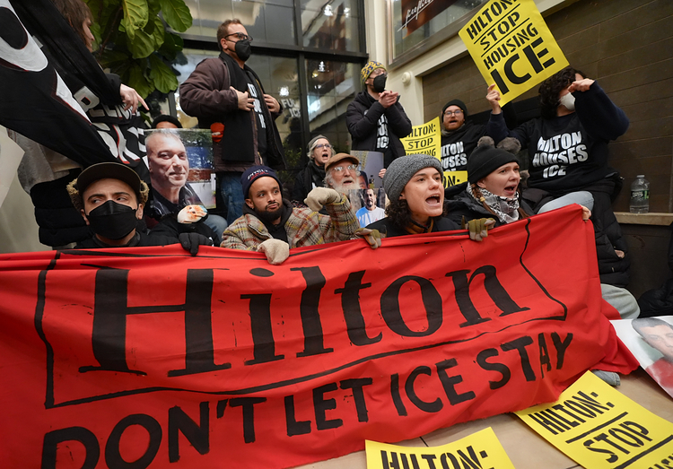 Göstericiler, ICE ajanlarının kaldığına inandıkları bir otelin önünde toplandı.