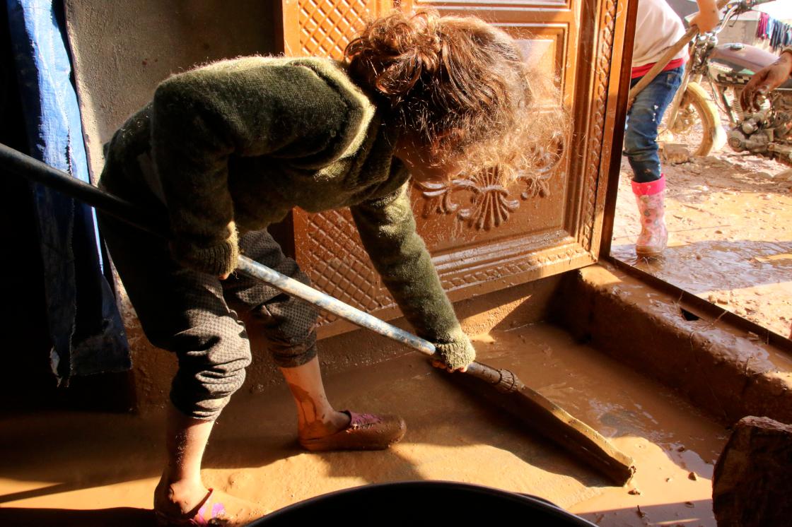 Ev edindikleri yapılarda ve çadırlarda çamurlu suyu küçük kovalarla boşaltarak eşyalarını kurtarmaya çalışan mağdurlar, ikinci bir yağışa karşı korumasız kaldı.