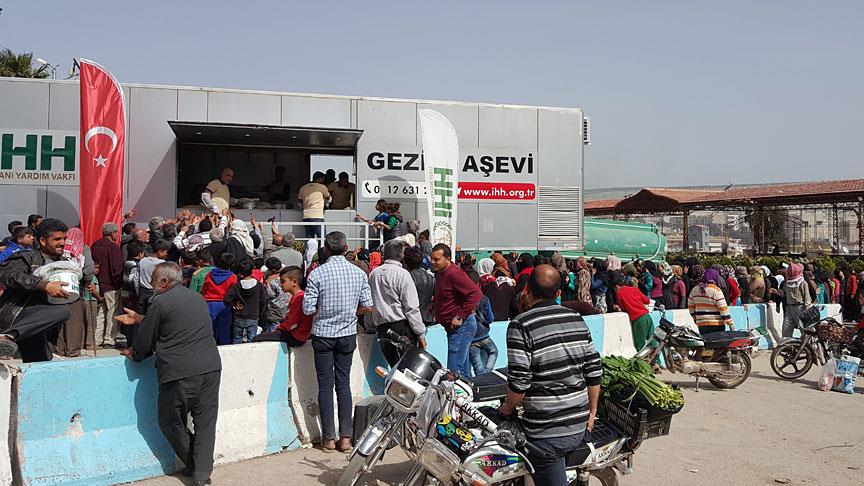 Türk Silahlı Kuvvetleri (TSK) ve Özgür Suriye Ordusu (ÖSO) tarafından terör örgütü PYD/PKK'dan temizlenen Afrin ilçe merkezinde kurulan İHH İnsani Yardım Vakfına ait gezici aşevi, siviller için tam kapasite çalışıyor.