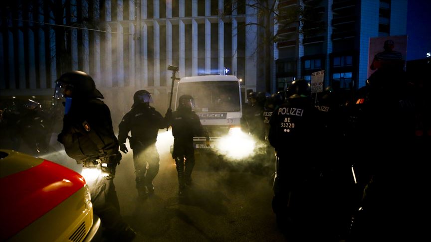 Almanya'nın bazı kentlerinde hükümetin uyguladığı yeni tip koronavirüs (Kovid-19) önlemleri protesto edilirken, Frankfurt kentinde göstericilere polis müdahale etti.