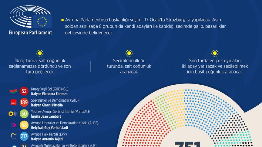 Avrupa Parlamentosunun (AP) yeni başkanı salı günü yapılacak seçimle belli olacak. Aşırı soldan aşırı sağa 8 grubun da kendi adayları ile katıldığı seçimde galibi, gruplar arasındaki pazarlıklar ve ittifaklar belirleyecek.