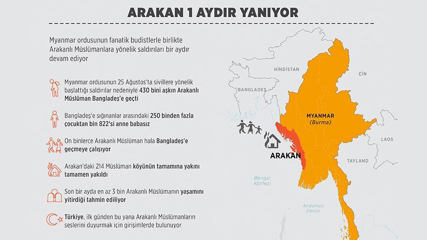 Myanmar ordusunun silahlı militanlarla mücadeleyi öne sürerek Arakan'da sivillere yönelik bir aydır düzenlediği saldırılardan şu ana kadar 430 bini aşkın Arakanlı Müslüman Bangladeş'e geçerek kaçmayı başarırken, en az 3 binin katliamlara kurban gittiği tahmin ediliyor, on binlerin kaçış mücadelesi ise sürüyor.